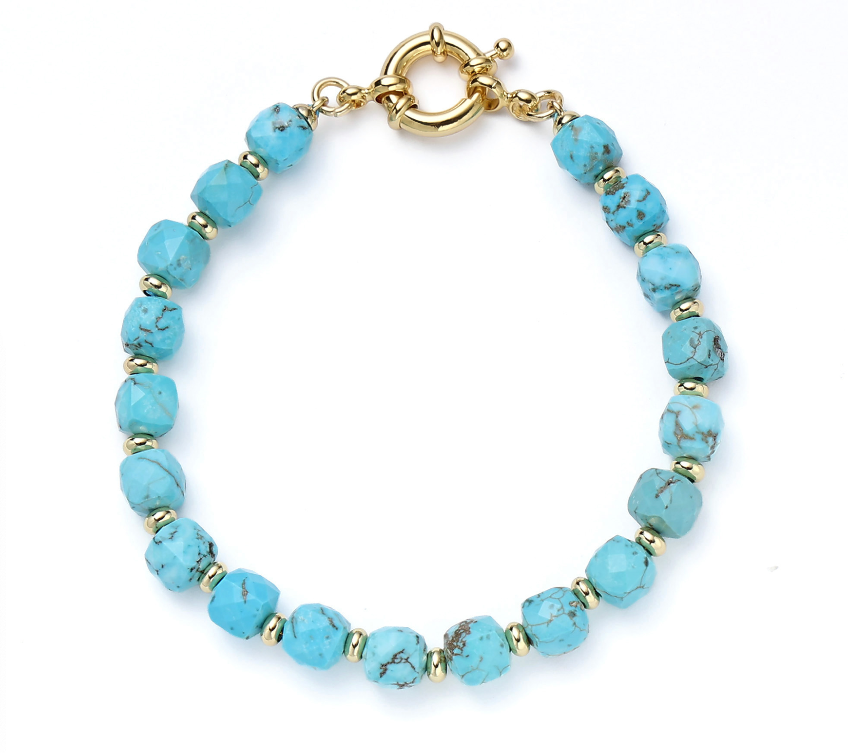 The bracelet is set with smooth turquoise stones that wrap comfortably around the wrist, their blue-green color adding an easy pop of character. Each stone feels natural and slightly different, giving the piece a relaxed, handcrafted vibe rather than anything flashy. It’s the kind of bracelet that works just as well worn every day as it does layered with others, bringing a calm, earthy feel that stands out without demanding attention.